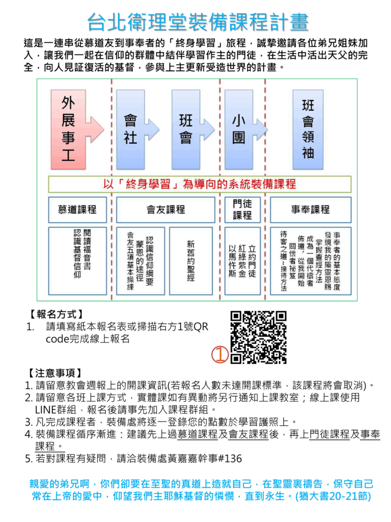 - 本堂裝備處第一季課程將於 3 月 17 日起陸續開課,邀請弟兄姊妹踴躍報名參與接受裝備造就,請參閱一樓公佈欄海報掃描 QR code 線上報名,或洽黃幹事報名。