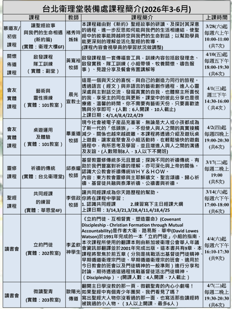 裝備處新一季課程將於三月起陸續開課,邀請弟兄姊妹踴躍報名參與接受裝備造就。